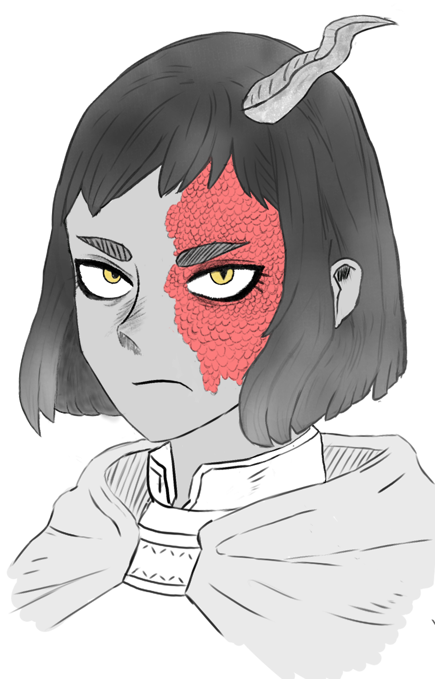 Eine Frau von kleiner Statur. Ein Teil ihres Gesichts ist überzogen mit scharlachroten Schuppen und aus ihrem Kopf ragt ein Horn hervor. Sie trägt oft Kapuzen oder andere Kopfbedeckungen, um ihr Gesicht zu verbergen.